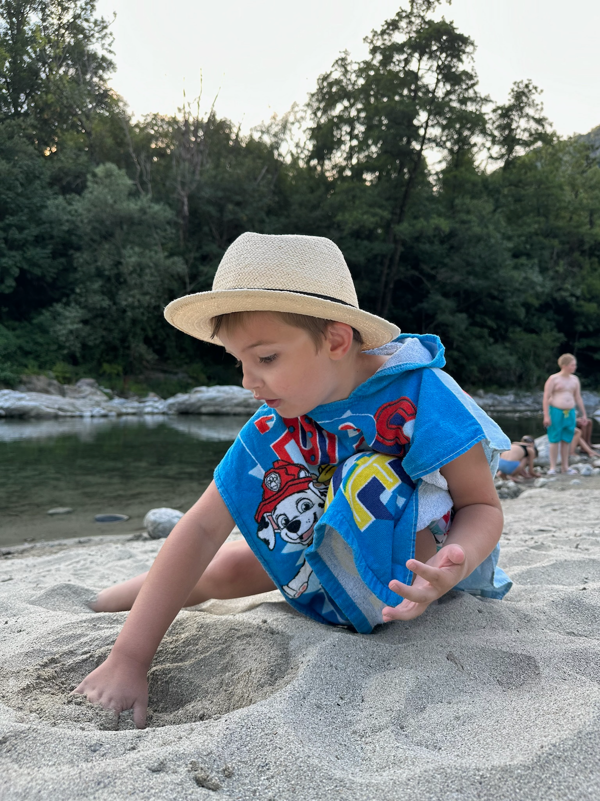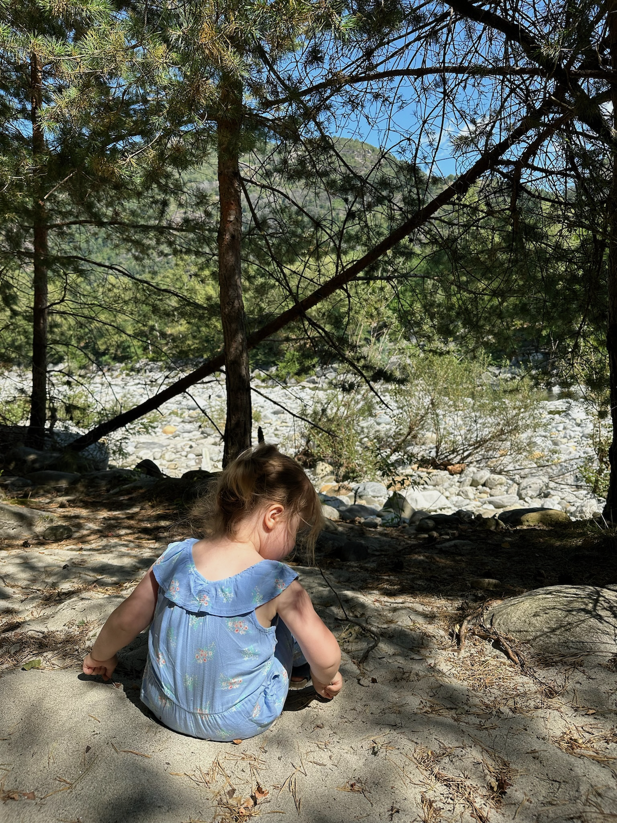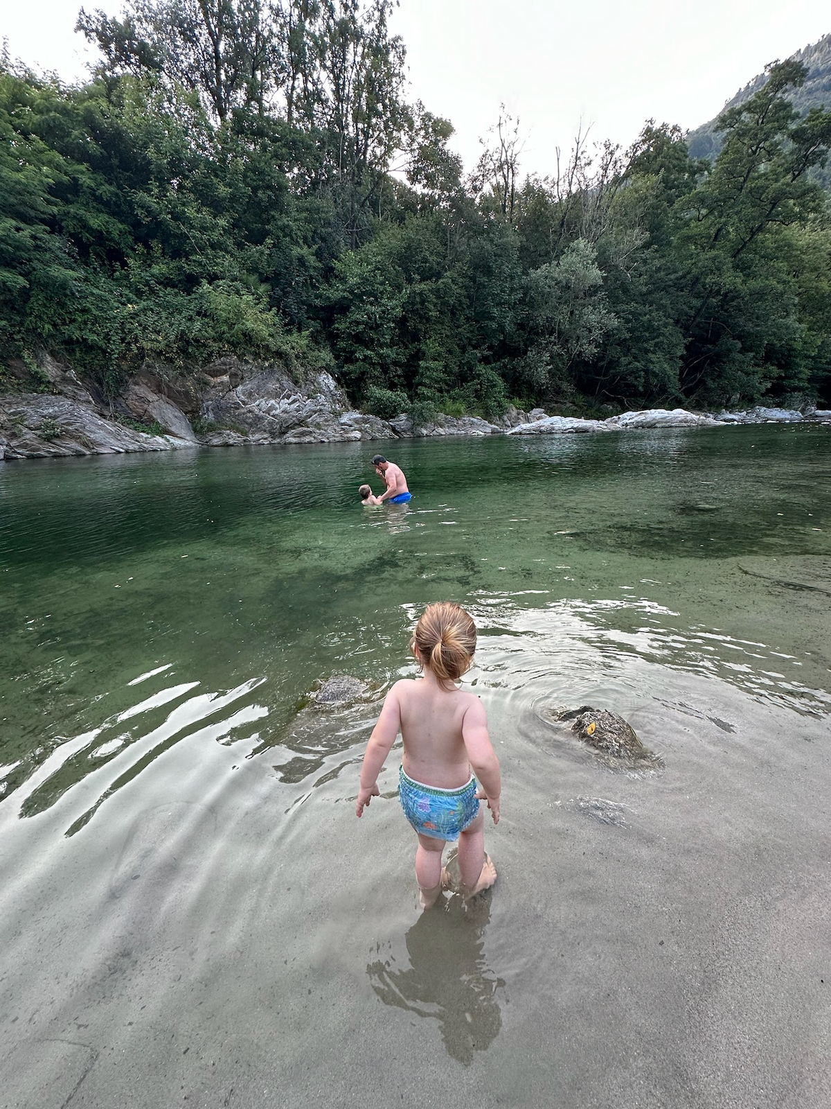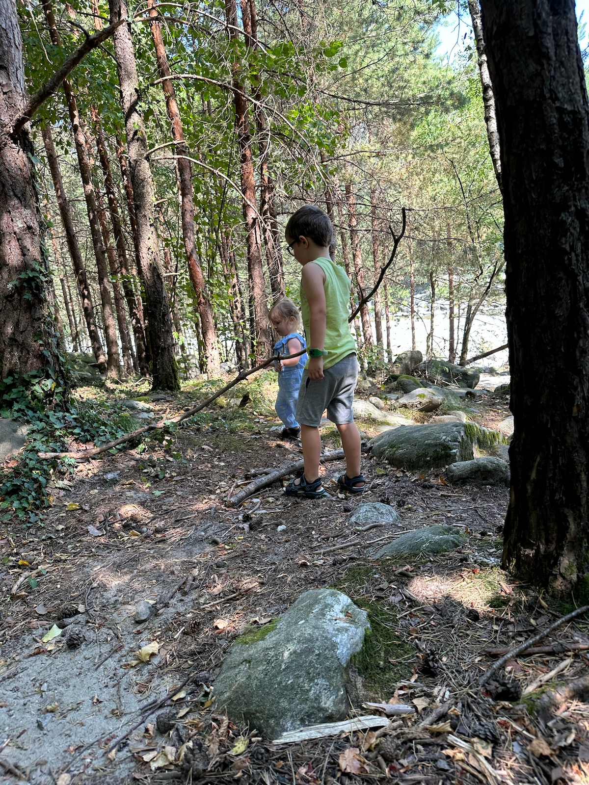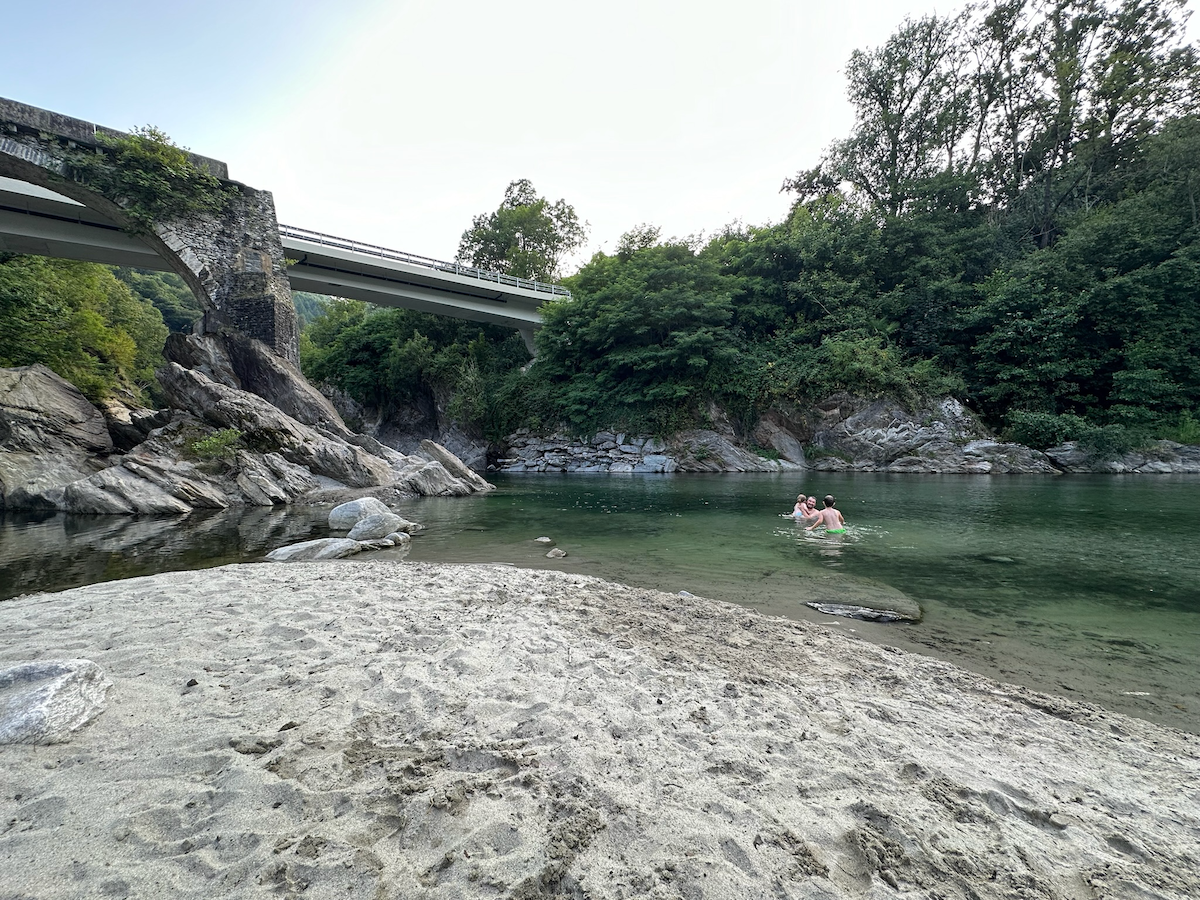 This time we visited a little village of Maggia. With the goal to visit the Cascata del Salto first then to head down to the river for a stroll. Little we knew that the waterfall is not accessible with buggy. Indeed it is a hiking trail gem. With the help of the locals, our crew quickly changed direction and headed to the river, Maggia. Dads took the cars, and Moms took the kids and the dog. Down in the village behind Migros, the suspension bridge, called Pontine di Maggia, leads across the Maggia river. The shore on the other side is easily accessible even with tiny feet (not with buggy though).